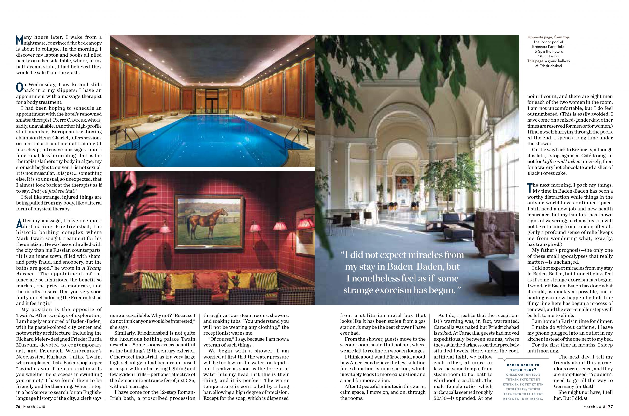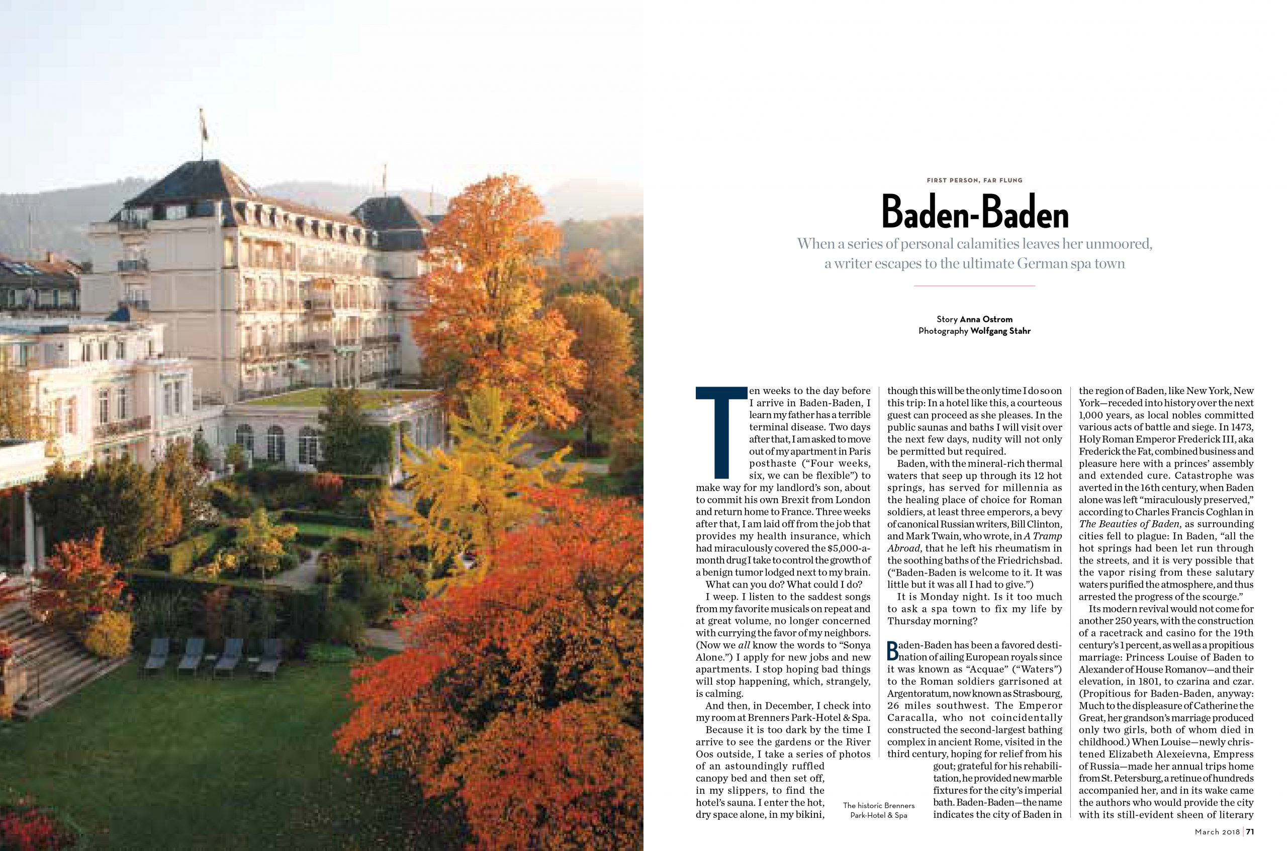 Baden Baden for United’s HemispheresTen weeks to the day before I arrive in Baden-Baden, I learn my father has a terminal, terrible disease. Two days after that, I am asked to move out of my apartment in Paris posthaste (“Four weeks, six, we can be flexible”) to make way for my landlord’s son, about to commit his own Brexit from London and return home to France. Three weeks after that, I am laid off from the job that provides my health insurance, which had, miraculously, uniquely, covered the $5,000-a-month drug I take to control the growth of a tumor lodged next to my brain.