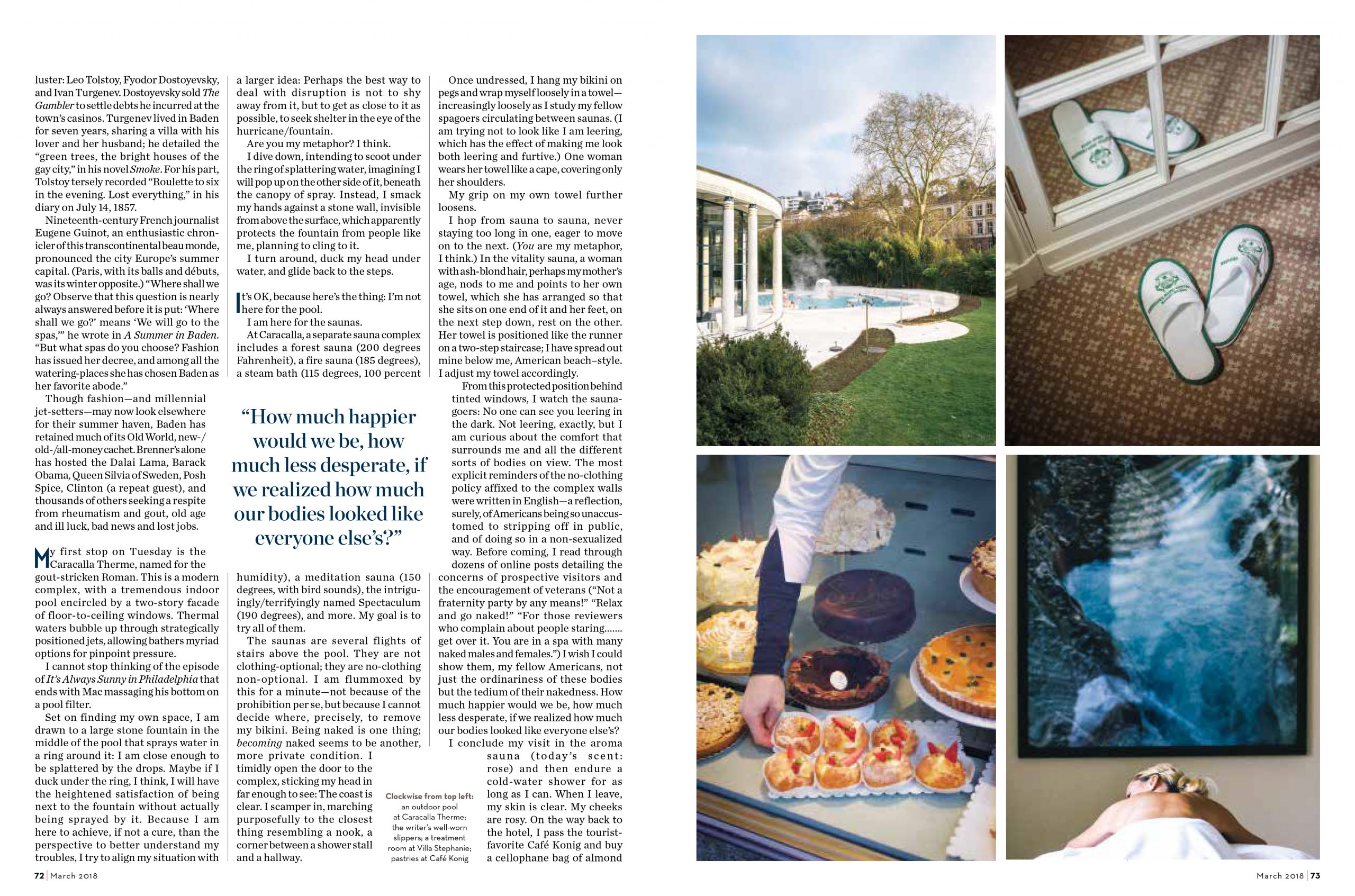 The saunas are several flights of stairs above the pool. It is not clothing optional. It is no-clothing non-optional. I am flummoxed by this for a minute — not because of the prohibition per se, but because I cannot decide where, precisely, to remove my bikini. Being naked is one thing; becoming naked seems to be another, more private condition. I timidly open the door to the complex, sticking my head in far enough to see: The coast is clear. I scamper in, marching purposefully to the closest thing resembling a nook, a corner between a shower stall and a hallway.