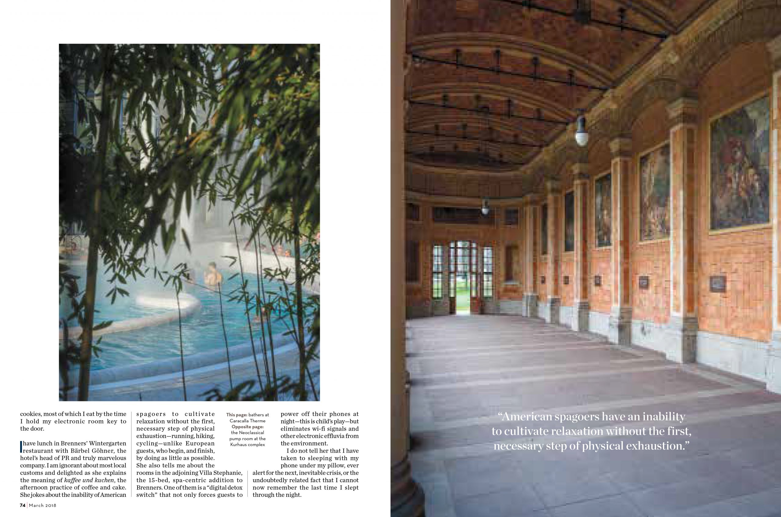 I have lunch in Brenners’ Wintergarten restaurant with Bärbel Göhner, the hotel’s head of PR. Usually these meals, a required element in covering a hotel like this, are interminable rituals of mutual obligation. Bärbel, though, is the exception to prove the rule, and marvelous company. I am ignorant about most local customs and delighted as she explains the meaning of “kaffee und kuchen,” the afternoon practice of coffee and cake. (We also discuss recycling, veganism, the politics of the 2013 Matt Damon film Elysium, and the inability of American spa-goers to cultivate relaxation without the first, necessary step of physical exhaustion — running, hiking, cycling — unlike European guests, who begin, and finish, by doing as little as possible.)